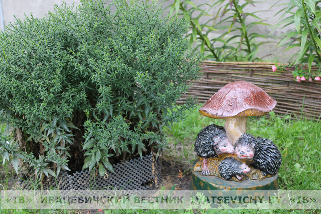 К слову, осенний сорт хризантем растет здесь хорошо, и совсем скоро цветы порадуют глаз. Есть здесь еще лилии и гортензии, но в этот раз акцент хочется сделать не столько на цветы, сколько на малые архитектурные формы. Ведь под окнами дома целый зоопарк: ежик, аист в гнезде, мышка, сказочный гном и любимец местной детворы – собака на цепи. Все фигуры когда-то были кем-то выброшены, а Сергей Юрьевич дал им вторую жизнь. Подкрасил, подклеил и теперь они как новые.